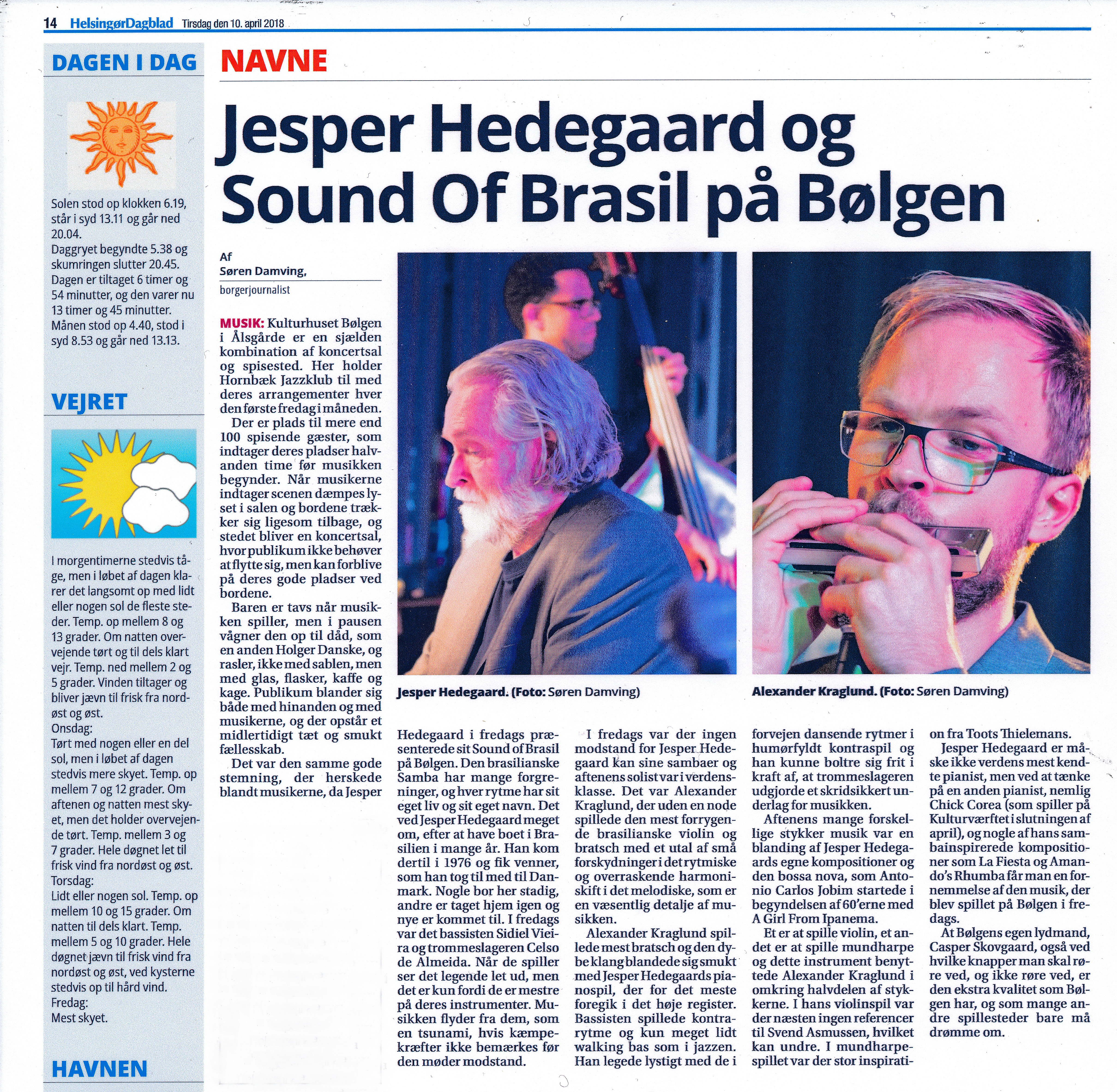 Det var den samme gode stemning, der herskede blandt musikerne, da Jesper Hedegaard i fredags præsenterede sit Sound of Brasil på Bølgen. Den brasilianske Samba har mange forgreninger, og hver rytme har sit eget liv og sit eget navn. Det ved Jesper Hedegaard meget om, efter at have boet i Brasilien i mange år. Han kom dertil i 1976 og fik venner, som han tog til med til Danmark. Nogle bor her stadig, andre er taget hjem igen og nye er kommet til. I fredags var det bassisten Sidiel Vieira og trommeslageren Celso de Almeida. Når de spiller ser det legende let ud, men det er kun fordi de er mestre på deres instrumenter. Musikken flyder fra dem, som en tsunami, hvis kæmpekræfter ikke bemærkes før den møder modstand.